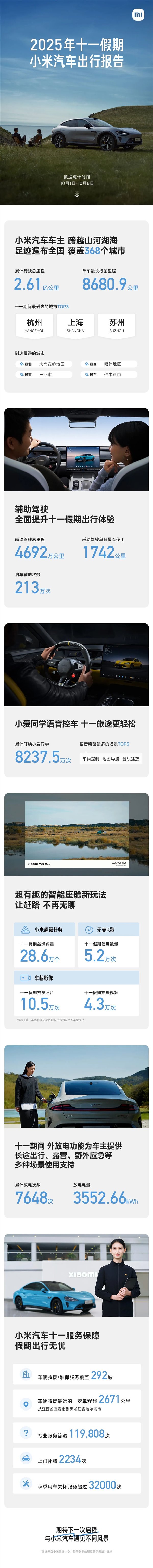 报告显示,十一假期期间,小米汽车车主们驾驶爱车跨越山海,累计行驶里程突破2.61亿公里,足迹广泛覆盖全国368个城市。