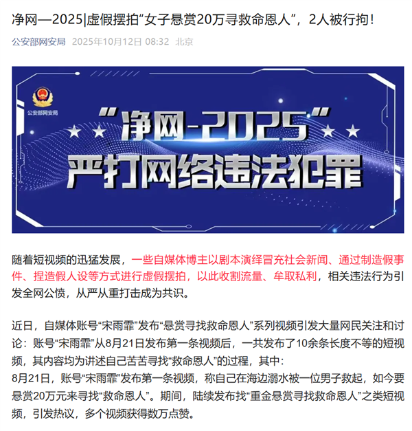 快科技10月12日消息,公安部网安局今日发文称,近日,自媒体账号“宋雨霏”发布“悬赏寻找救命恩人”系列视频引发大量网民关注和讨论: