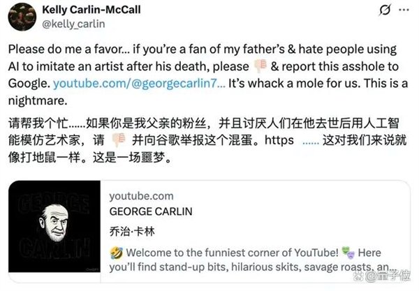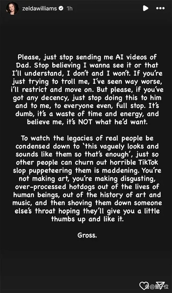 值得一提的是,不单单只有泽尔达,已故喜剧演员乔治·卡林的女儿也表达了类似的观点。她觉得使用她父亲肖像的视频既“令人难以忍受,又令人沮丧”。