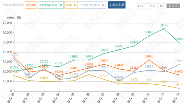 一个是哈弗 H6 ,在宋 PLUS 打击下,它直接从王者跌成亡者,一路下跌再无翻盘,到如今还不足 5000 ;