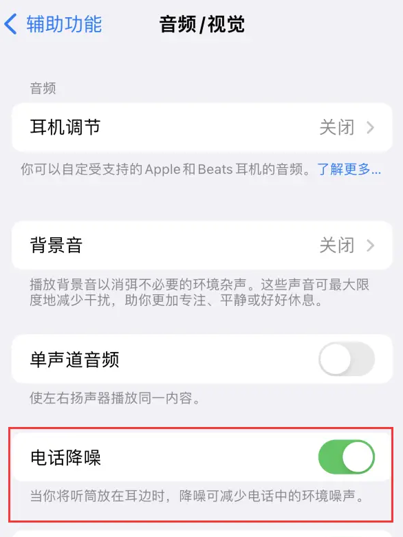 此外,iPhone还有“电话降噪”功能,在拨打或接听电话,且听筒放在耳边时,降噪可以减少电话中的环境噪声。将有效帮你减少听到周围嘈杂的声,让你能够听清楚对方讲话的内容。可以在iPhone设置-辅助功能-音频/视觉中找到。