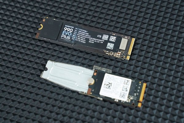 二是要看插槽支持的M.2固态硬盘的长度规格,是2280还是2242,它们的区别主要是长短,例如我们拆机原配固态硬盘就是2242规格(下图下),不过却配备了延长支架,是妥妥的2280规格,而三星990 EVO Plus也是2280规格,可以说完美适配。