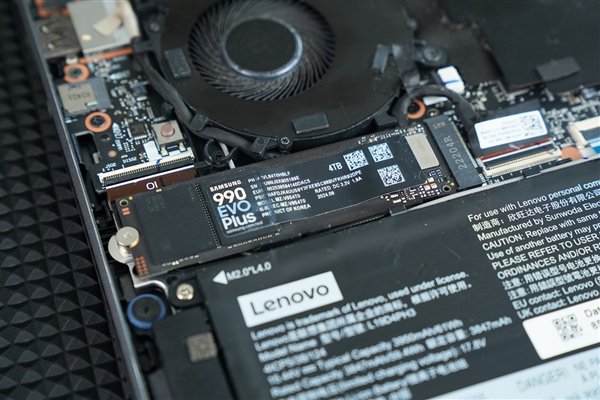 将新固态硬盘安装在M.2插槽并拧上固定螺丝,然后装回后盖即可展开下一步了。由于这块三星990 EVO Plus固态硬盘我们之前进行过多次装机测试,产品标签有些磨损,因此并非全新产品,不过大家也不要在意这些细节。