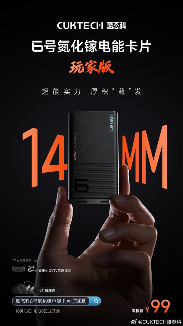 快科技10月15日消息,酷态科6号电能卡片玩家版发布,目前已经正式开售,定价99元。