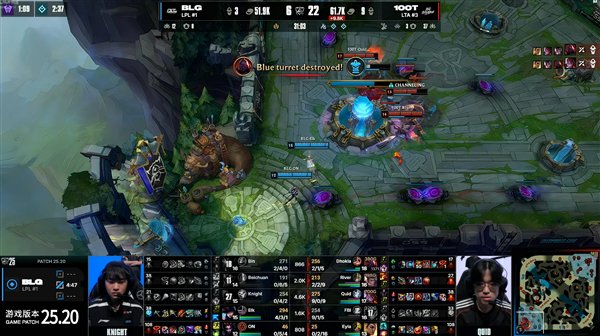 此时BLG阵型分散,打野北川的皇子强行抢龙失败被秒,中单Knight的岩雀技能释放混乱反堵退路,AD Elk的女警因装备未成型输出乏力。