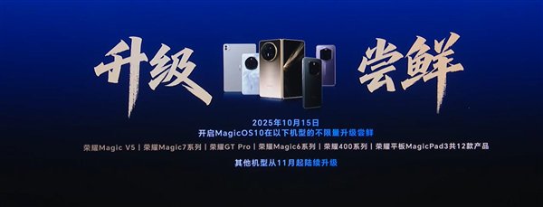 这些机型包括荣耀Magic V5、荣耀Magic7系列、荣耀GT Pro、荣耀Magic6系列、荣耀400系列、荣耀MagicPad3。