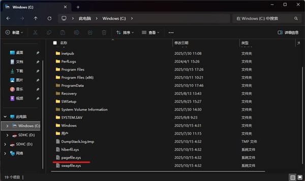 再打开C盘,就能够看到下方有个名为“pagefile.sys”的文件,它就是虚拟内存。