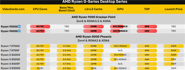 在此之前,我们一直以为锐龙9000G系列会基于主流移动版Strix Point,也就是锐龙AI 9 300系列,最多12核心24线程、36MB缓存、5.1GHz加速频率、16个GPU核心,热设计功耗也是最高54W。