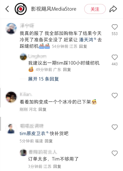 有网友调侃称:“我全部加购物车了结果今天冷死了准备买全没了,赶紧让潘天鸿去踩缝纫机。”“我建议出一期Tim踩100小时缝纫机。”