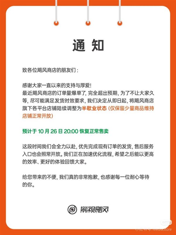 通知显示:最近飓风商店的订单量完全超出预期,为了不让大家久等,尽可能满足发货时效要求,公司决定从即日起,将飓风商店旗下各平台店铺陆续调整为半歇业状态(仅保留少量商品维持店铺正常开放)。