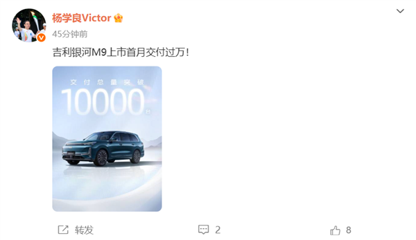 快科技10月22日消息,吉利银河官方宣布,吉利银河M9上市1个月,交付总量突破万台。