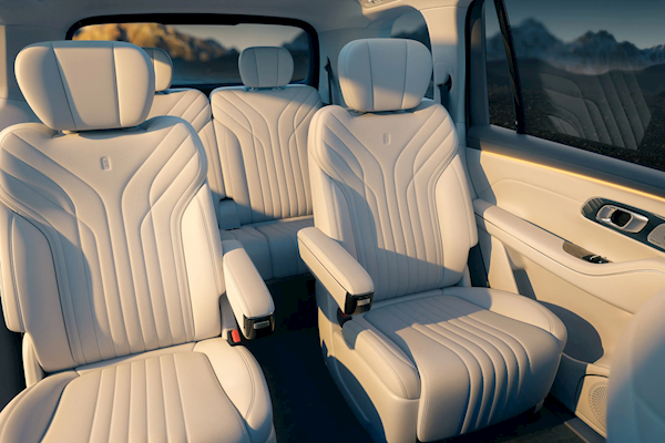 采用2+2+2的六座布局,座椅采用打孔真皮材质,中央通道后方设有一个大尺寸的扶手箱,第二排为两个独立航空座椅,过道宽度有180mm,配备无缝腿托、腰托,具备通风、加热、10点按摩。