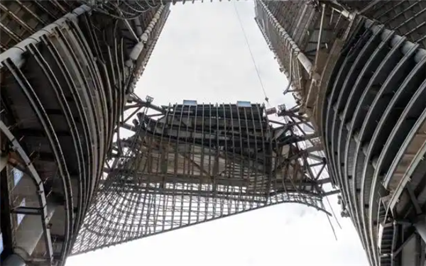 C塔采用超高层双子塔设计,东、西两塔通过一座结构复杂的非对称连廊紧密相连。该连廊具备“超跨、超重、超高、超精”四大特点:最大跨度达78米,整体重量约6000吨,相当于4000辆家用轿车的总重量;提升高度约120米,约等于40层住宅楼的高度;精度控制严格遵循AESS4.0级标准,达到毫米级别。