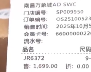 一位顾客反映,自己在南昌万象城花1699元买了一双阿迪达斯的“零系列”跑鞋,3个小时后发现这双鞋竟然脱胶了,而自己还没开商场。