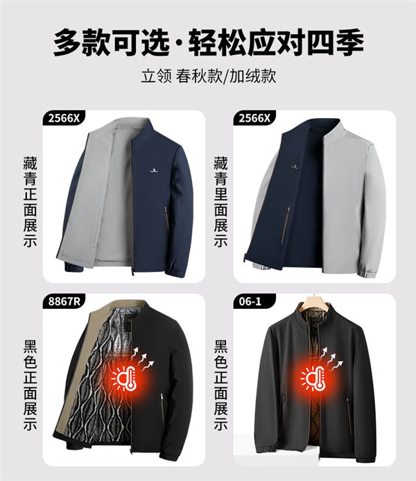型号 2566/2566X 为双面穿夹克,8867X 为牛奶丝夹克、08-1/06-1/8867R 为加绒加厚夹克,09 为时尚立领夹克,8867M 为加棉保暖夹克,3136 为连帽可拆卸夹克。