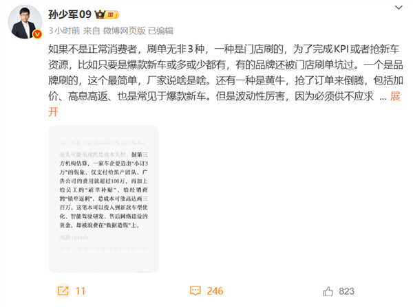 一种是门店刷的,为了完成KPI或者抢新车资源,比如只要是爆款新车或多或少都有,有的品牌还被门店刷单坑过。