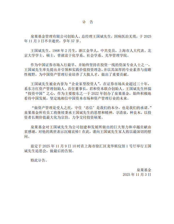 快科技11月3日消息,今日,泉果基金发布讣告,泉果基金管理有限公司创始人、总经理王国斌,因病医治无效,于2025年11月3日去世,年仅57岁。