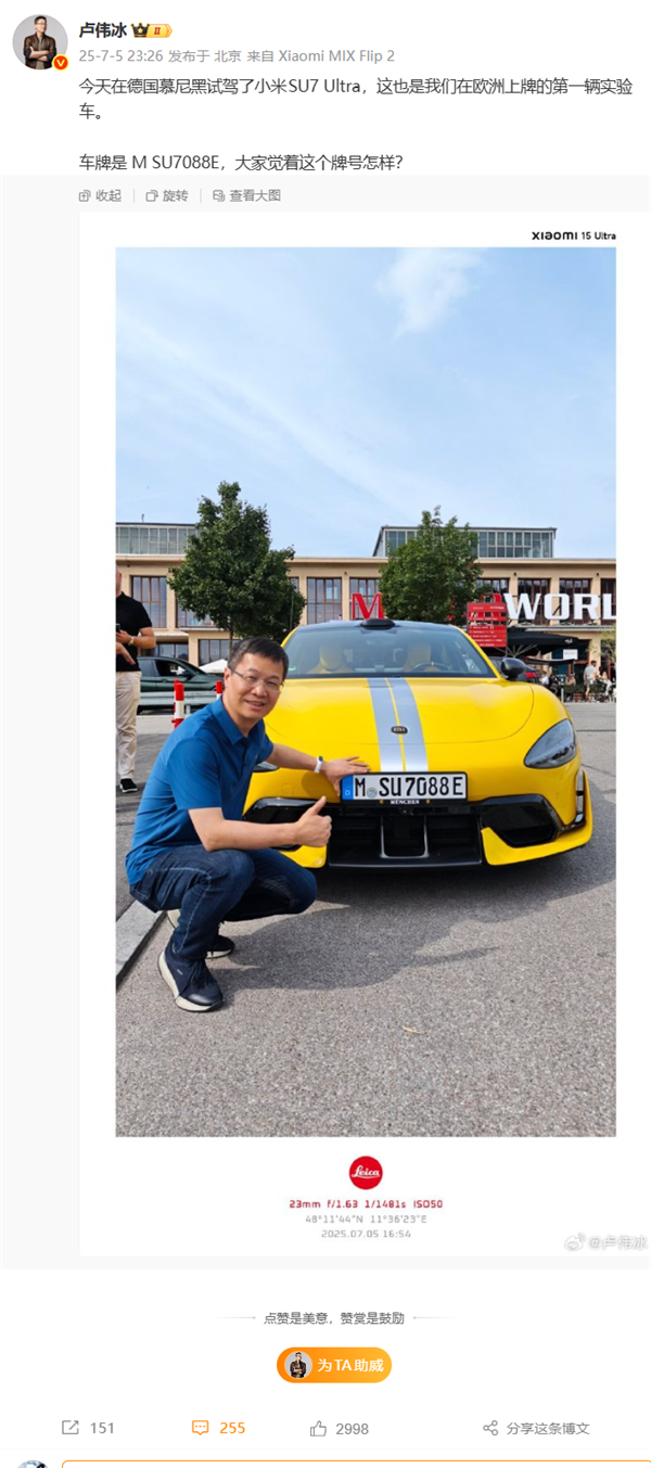从卢伟冰晒出的照片来看,这辆SU7 Ultra有两点特别之处:一是它是小米在欧洲上牌的第一辆实验车;二是车牌号“M SU7088E”,其中“M”寓意“小米”,“SU7”则对应车型名称。