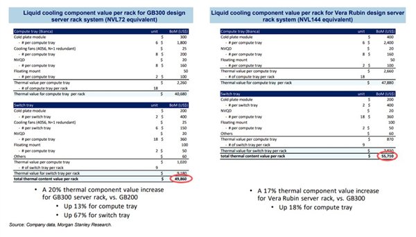 摩根士丹利预计,下一代Vera CPU、Rubin GPU的功耗会更高,其中GPU将高达1800W,还有NVSwitch 6.0交换机也会更耗电,散热成本也就随之水涨船高。