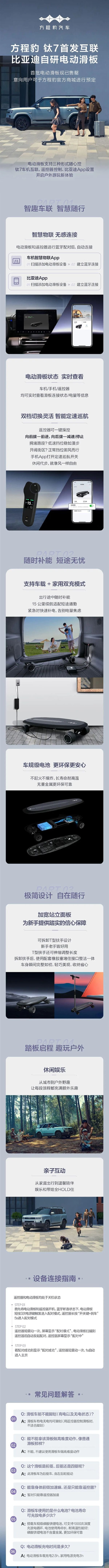 同时,电动滑板支持三种形式随心控:钛7车机互联、遥控器控制、比亚迪App设置等。