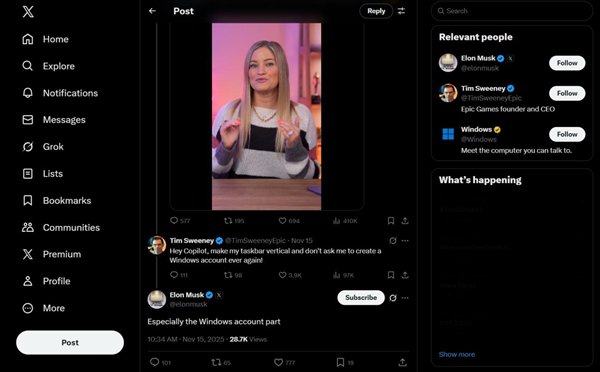 有意思的是,Tim Sweeney在评论区嘲讽地要求Copilot AI帮助他将任务栏恢复为垂直状态,并“永远不要再要求他创建一个Windows账户”。