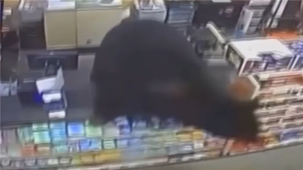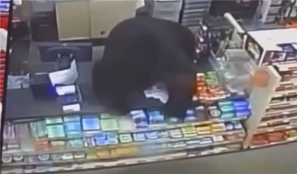 科尔跑到收银台寻求店员帮助,两人在店内来回奔跑,黑熊竟然跳上收银台,试图接近男孩,惊悚的画面被店内监控全程记录。