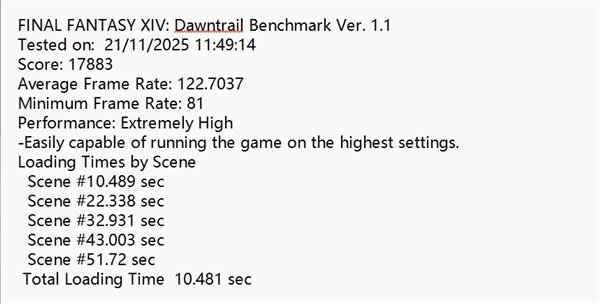 接下来我们将其作为游戏盘进行读取测试,在《最终幻想XIV:晓月的终焉》测试中,总加载时长为10.481秒,对于共有5个场景的3A游戏来说显然是不错的成绩,也就是说,即使将其作为游戏盘直连电脑进行游戏,金士顿Dual Portable也能有非常流畅的加载速度。