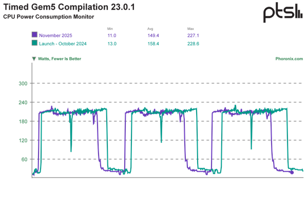 同时值得关注的是,性能提升的同时,该处理器功耗仅为去年10月的85%,降幅达15%。这表明英特尔通过软件优化,既降低了处理器的功耗与发热量,又进一步挖掘了Arrow Lake-S 芯片的性能潜力。