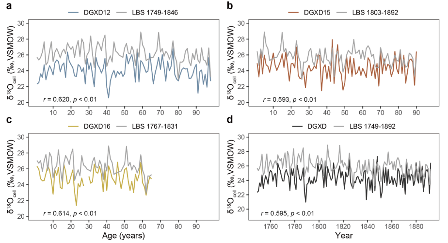研究团队将目光投向了树木自身携带的“时间密码”——树轮氧同位素。与传统的树轮宽度分析相比,树轮氧同位素受个体差异影响小,能更稳定、清晰地记录树木生长时期的共同气候信号,因此在定年和溯源方面潜力巨大。