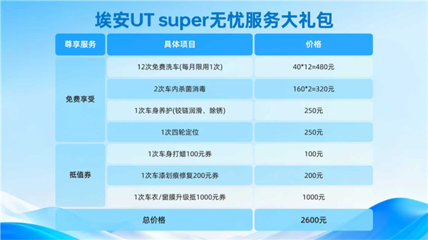 此外,对于三方前期服务衔接不足对用户造成的不便,广汽埃安宣布对在12月31日前下定购买埃安UT super的用户加码赠送价值2600元的“无忧服务包”。