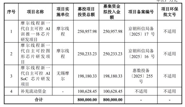 其中 25.09 亿元用于摩尔线程新一代自主可控 AI 训推一体芯片研发项目,25.02 亿元用于摩尔线程新一代自主可控图形芯片研发项目,19.81 亿元用于摩尔线程新一代自主可控 AISoC 芯片研发项目。