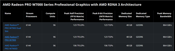 W7900D的详情页暂未上线,因此不清楚散热设计,只公布了部分关键参数,基本就是W7900的降频版本,算力削减了大约14%。