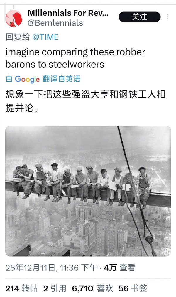 网友称,《时代周刊》年度人物封面用“邪恶”大资本家群像“致敬”1932年建造摩天大楼的劳工空中午餐,用“工人的敌人”替换掉工人本身,玷污了这张传奇的照片。
