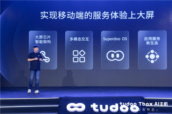 曹玮介绍,tudoo Tbox AI主机以“让服务体验回归大屏”为核心理念,通过全新pad级大屏芯片智能架构、多模态交互、自研AI OS操作系统与开放应用生态等四大核心技术,尝试解决当前电视大屏“开机率低、使用割裂、互动缺失”等核心痛点。