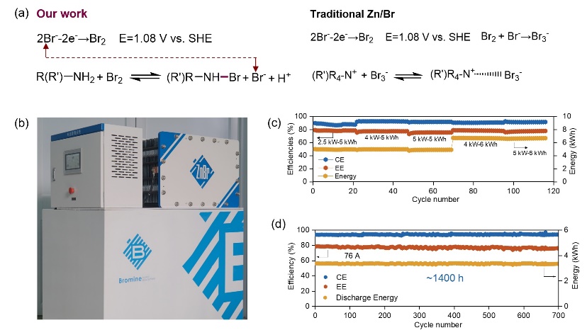 近日,我所储能技术研究部(DNL17)李先锋研究员团队在溴基多电子转移液流电池新体系研究方面取得新进展,开发出一种新型溴基两电子转移反应体系,并将其应用于锌溴液流电池中,实现了长寿命锌溴液流电池的概念验证及系统放大。