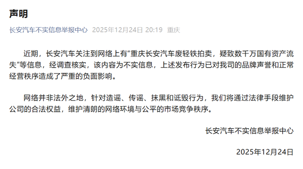 快科技12月24日消息,长安汽车不实信息举报中心今日发文称,近期,长安汽车关注到网络上有“重庆长安汽车废轻铁拍卖,疑致数千万国有资产流失”等信息。
