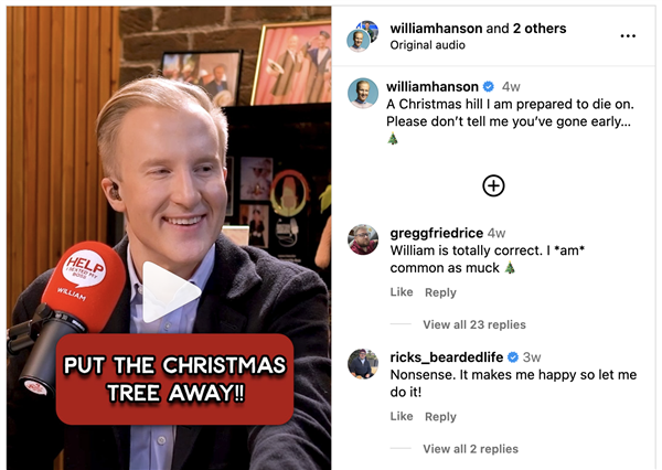 今年礼仪专家威廉·汉森在一档播客节目上说的一句话,让西方的群众又吵了起来:如果你在11月就把圣诞树摆上了,那只能说明你太俗了、太没品味了。