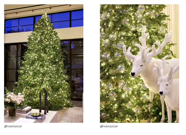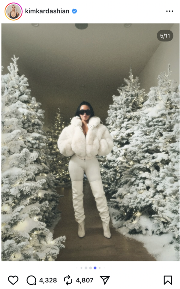 在最近,金·卡戴珊在ins上发了一组Skims和The North Face的联名先导。在这组照片里,左右两边的圣诞树只用了白色的仿雪泡沫和极少的小灯作为装饰,显得特别“自然”。