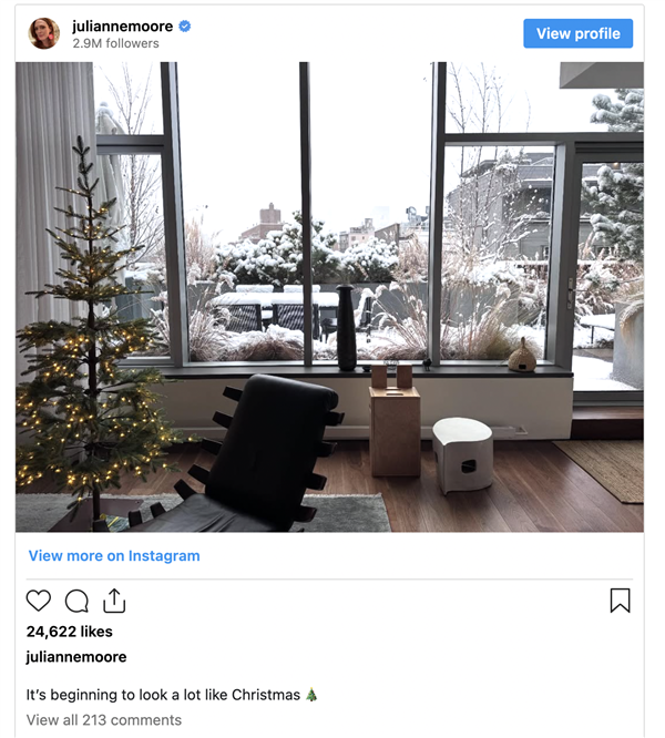 随着朱丽安·摩尔、米歇尔·菲佛和维多利亚·贝克汉姆等名人纷纷效仿,这种风格迅速流行开来。夸张到,现在在TikTok和Instagram等一系列平台上,只要搜索“圣诞树”就能看到,热度最高的几条内容几乎都走的是性冷淡风。