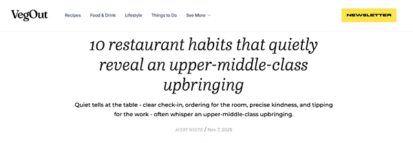 Vegout的作者艾弗里·怀特就表示,自己在成为餐厅经理后有一个绝招:能从食客进门的短短二十秒钟分辨出对方是不是上层人士。