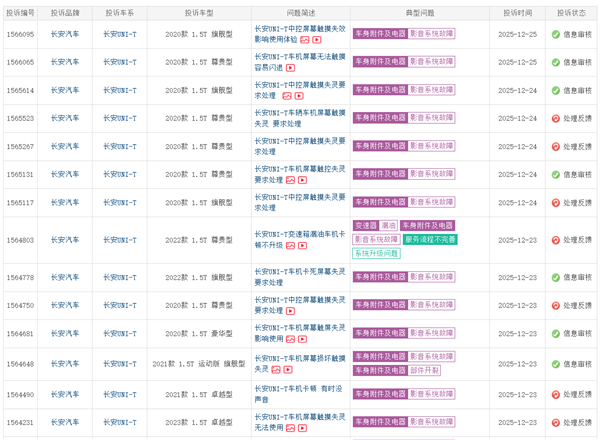 快科技12月26日消息,第三方汽车投诉平台 【下载黑猫投诉客户端】车质网显示,长安UNI-T近日遭到车主集体投诉,投诉原因多为中控屏幕触控失灵,无法点击,涉及车型主要集中在2020-2021款。