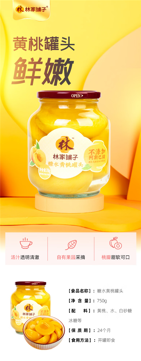 辽宁大连老牌【林家铺子官方旗舰店】,林家铺子糖水黄桃罐头 750g 商超日常售价 15.9 元,今日官方两瓶券后仅需 15.8 元,折合 7.9 元 / 瓶包邮。