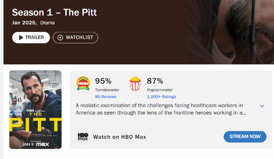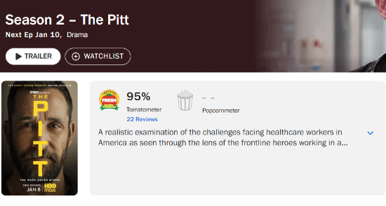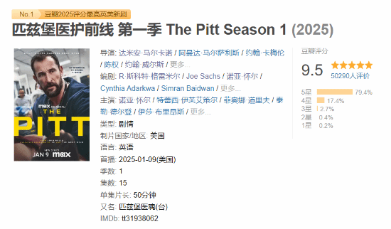 值得一提的是,《匹兹堡医护前线》的第一季评价超高,IGN给出了满分评价,烂番茄新鲜度95%,豆瓣评价高达9.5分,第一季同样也是2025年豆瓣评分最高的英美新剧第一名。