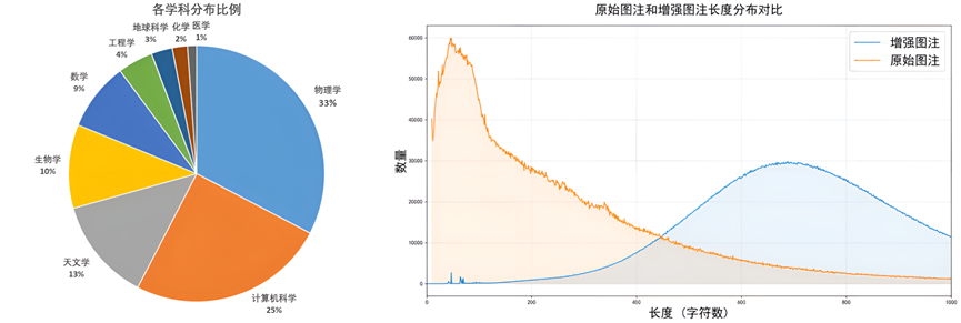 科研论文中的原始图注往往存在描述过短、关键信息缺失、上下文不足、逻辑链条不完整、专业性不均衡等天然缺陷,使多模态模型难以完整理解科研图像背后的实验含义。为解决这一长期痛点,研究团队基于多模态大模型体系构建了面向科研语境的自动语义增强机制,并对全部1550万条图注进行了系统化增强解读。