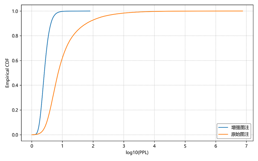 图2. 文本质量经验累积分布曲线。横坐标为log??(pseudo-PPL),表示基于 SciBERT 掩码语言模型计算得到的文本困惑度水平;纵坐标为经验累积分布值。