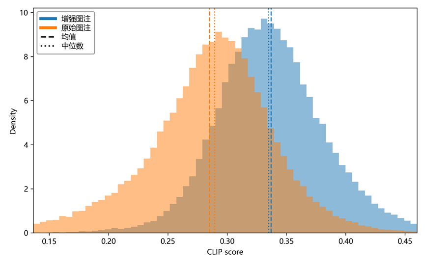 在图文一致性方面,基于CLIP的语义对齐评测表明,增强后的图文相似度均值提升18.21%,整体分布右移并伴随约27.77% 的方差收缩。这一变化说明增强文本能够提供更明确的跨模态关联线索,使图像中的关键结构、变量与实验语义在文本侧得到更稳定的对应表达,从而提升模型在对齐阶段的信号质量与训练稳健性。