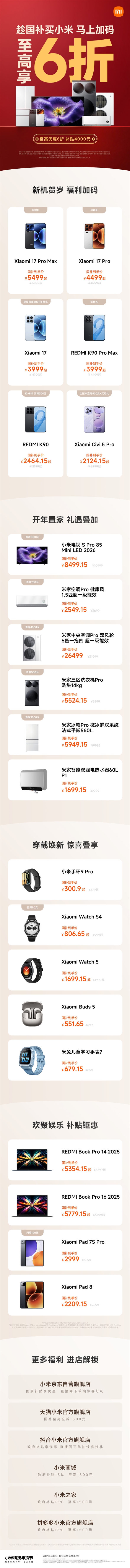 快科技1月15日消息,小米官方今天发文宣布,小米2026年国补全面开启,实现全品类覆盖,最高可实现6折优惠,补贴4000元。
