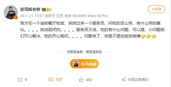 快科技1月21日消息,今日,张雪峰发微博称,自己在一家连锁餐厅吃饭被服务员问建议。