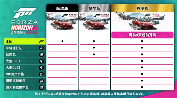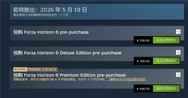 目前,《极限竞速:地平线6》售价已公布并开启预售,Steam国区标准版定价298元,豪华版398元,尊享版498元,购买尊享版可提前4天解锁游戏。