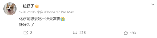 截至目前,其小号最后一条微博内容为:“化疗前想去吃一次朱富贵,馋好久。”